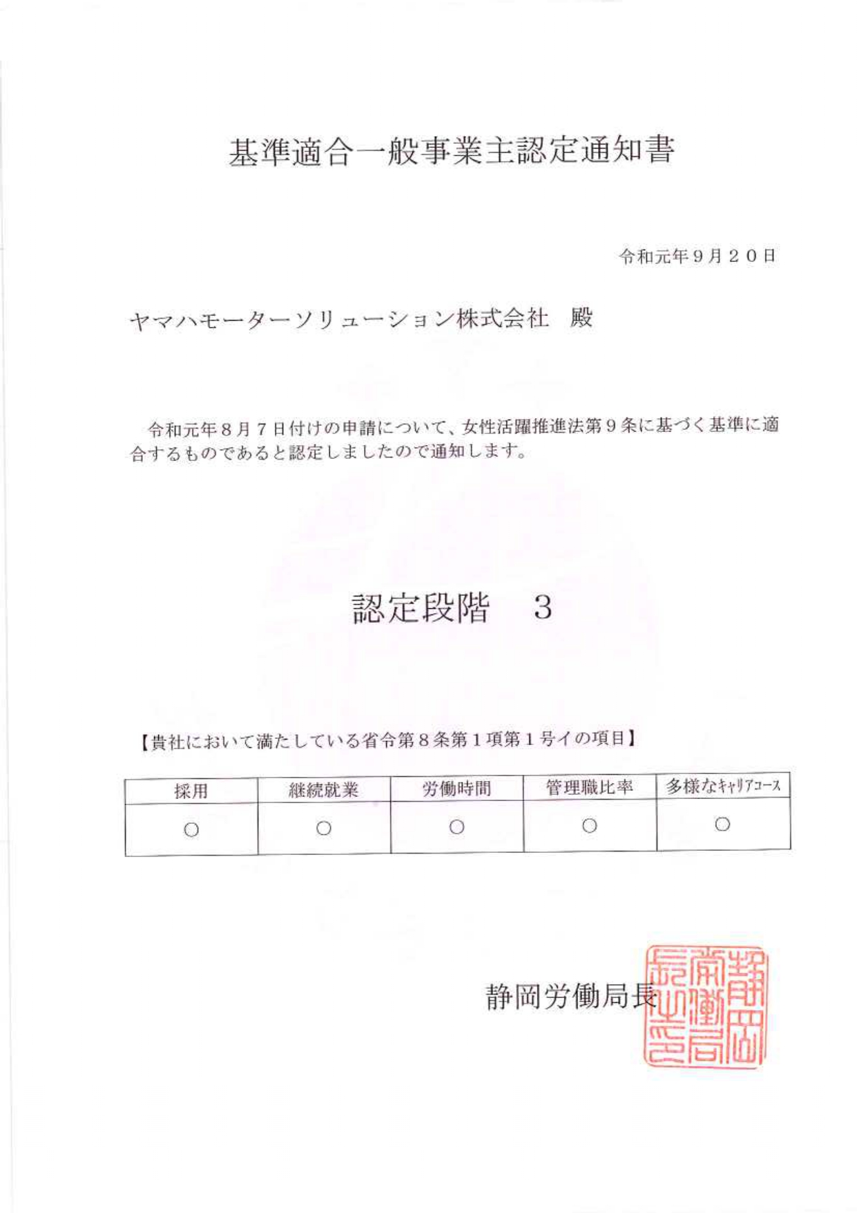 2019年10月7日 「えるぼし」認定を取得しました。